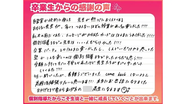 生徒たちを笑顔にできる先生を募集しています! 個別指導まなびプラスは、生徒一人ひとりの可能性を引き出し、学ぶことの楽しさや達成感を伝えていく個別指導教室です。 小学生から高校生までを対象にした個別指導スタイルで、生徒の学びをサポートしていただく講師を募集。 生徒が多く在籍しているため、やる気のある方にはすぐに授業をお任せします。 一人ひとりのペースに合わせて教えられる環境なので、「誰かの力になりたい」「子どもたちの成長を支えたい」という気持ちがあれば、経験は問いません。 勤務は柔軟に調整可能。 長めの時間勤務できる方は1日3コマ、短時間勤務を希望する方は1日1コマだけでもOKです。 自分のライフスタイルに合わせて無理なく働ける環境です。 「生徒の立場に立って考えられる人」「悩んでいる生徒に寄り添える人」そんな方を歓迎します。 教え方やコミュニケーションの取り方は、研修制度を通じてしっかり学べるので、未経験の方でも安心してスタートできます。 また、女性講師・社会人講師も多く活躍中。 生徒と向き合う中で培われる“伝える力”や“聴く力”“人と関わる力”は、就職活動や社会人生活でも大きな武器になります。 実際に、これまで多くの先輩たちが、この仕事を通してコミュニケーション能力や人間力を磨き、社会で活躍しています。 生徒たちの笑顔と成長を支えながら、自分自身も成長していける。 そんなやりがいのある環境で、あなたも一緒に働いてみませんか?特徴 / 仕事内容